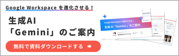 株式会社TSクラウドでは、Google Workspace を進化させる生成 AI「Gemini」がわかる資料をご用意しています。無料でダウンロードできますので、ご活用ください。