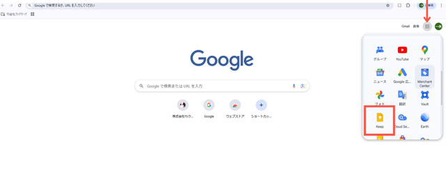 - Googleアカウントにログインした状態でアプリランチャーを開き、Google Keep のアイコンをクリックします。