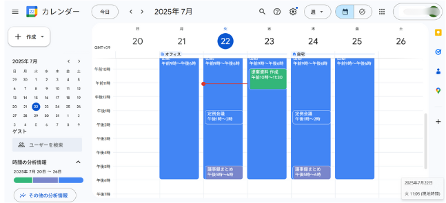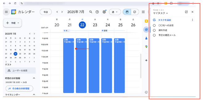 Google カレンダーは、タスクを時間軸で管理するのに最も適したツールです。PC では週・月単位でスケジュールを俯瞰しやすく、ドラッグ&ドロップで直感的に時間調整ができます。スマホアプリは、外出先での急な予定の確認や追加に便利です。