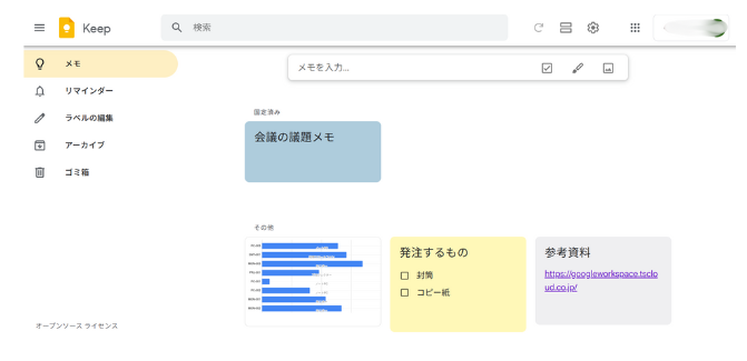 Google Keep は、まるでデジタルの付箋のように、アイデアやメモを気軽に記録できるツールです。テキストだけでなく、手書きメモ、音声メモ、画像の貼り付けにも対応。スマホアプリは起動が速く、音声入力や写真メモなど、外出先でのとっさのメモに便利。PC 版は、インストールせずにWeb上で操作できます。