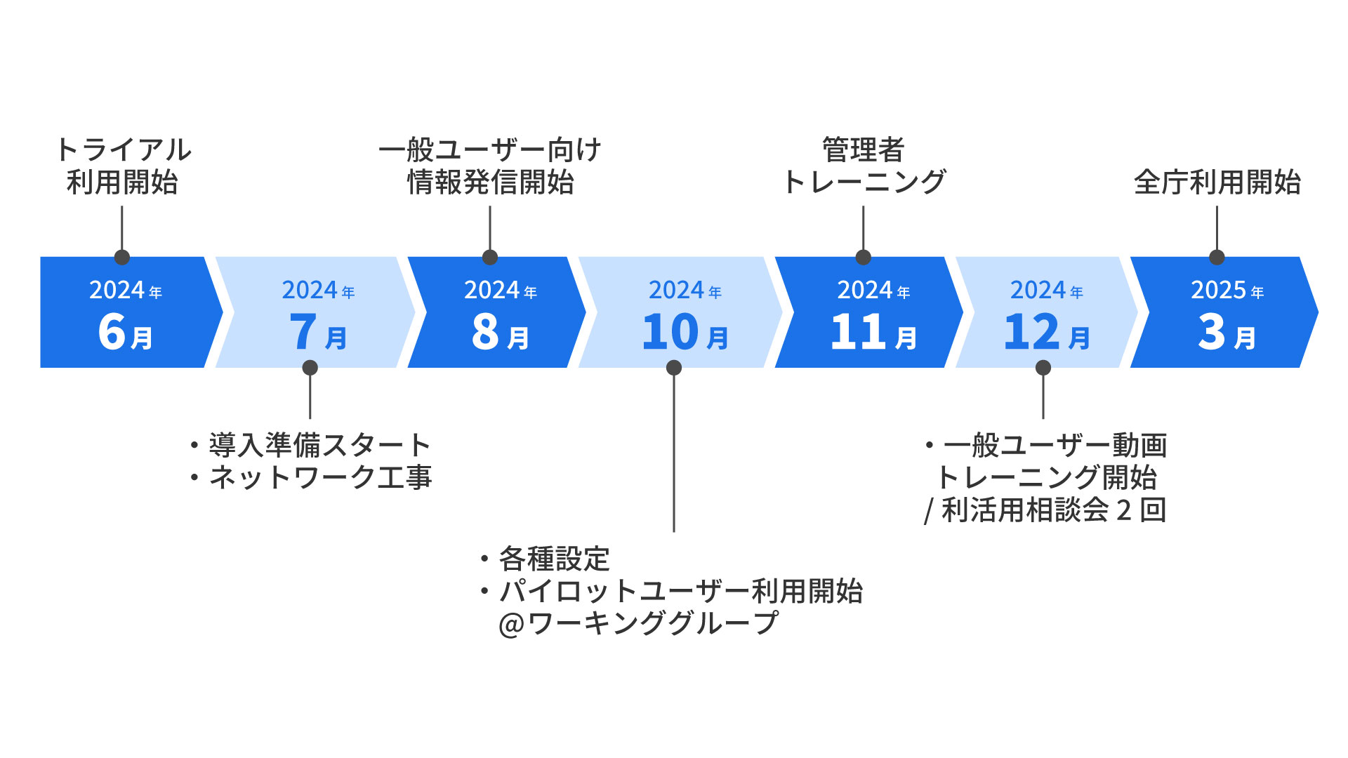 Google Workspace 導入プロジェクトは情報政策課が主導し、課内の情報システム係や DX 推進係と連携して開始。特に自治体は機密情報を扱うため、セキュリティ対策は情報システム係と協議しながら丁寧に行う必要がありました。2024年6月頃からトライアルを開始し、ネットワーク設定や導入準備に取り組みました。