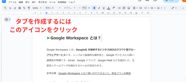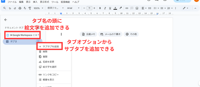 2024 年 10 月より導入された新しい機能で、長くて複雑なドキュメントをタブで分割し、見やすく分かりやすい構造に整理できます。Google スプレッドシートのタブのように見出し間を移動でき、タブ名に絵文字を追加して視認性を高めたり、ドラッグ&ドロップでタブを並べ替えたり、共同作業の効率化が可能です。