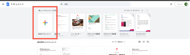 ドキュメントのトップページが開いたら、「新しいドキュメントを作成」という表示の下にある「空白」またはテンプレートを選択し、新規ドキュメントを作成します。