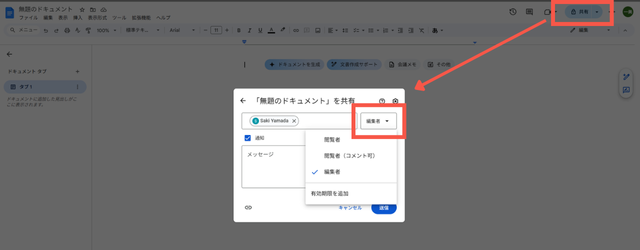 指定したユーザーはドキュメントにアクセスできるようになり、選択した権限の範囲内で共同編集ができるようになります。