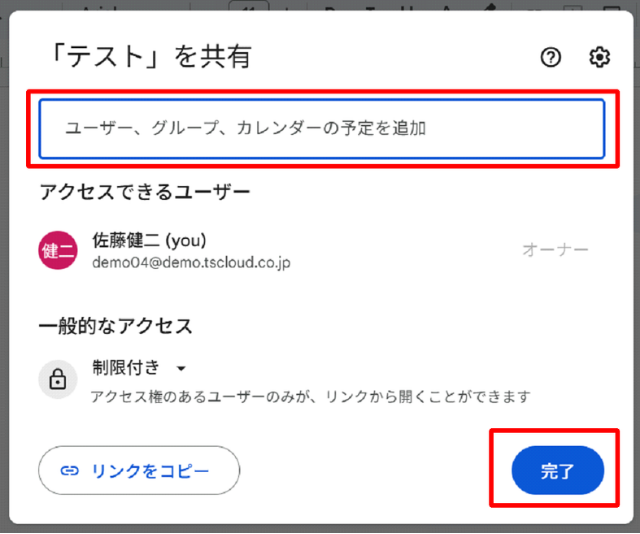 ドキュメントを開いたら、画面右上にある「共有」ボタンをクリックします。共有ダイアログが表示されるので、以下のいずれかの方法で共有相手を追加します。