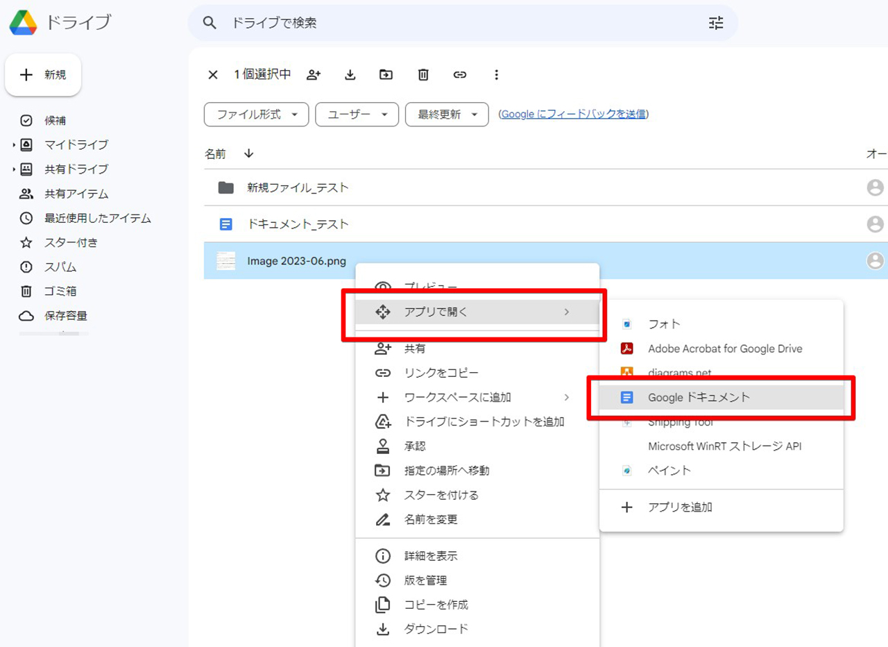 - 右クリックから「アプリで開く>Google ドキュメント」を選択