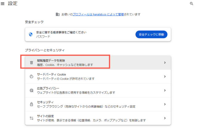 - 「プライバシーとセキュリティ」にある「閲覧履歴データの消去」をクリック