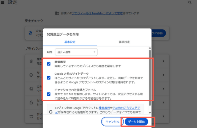 - 「閲覧履歴」「Cookieと他のサイトデータ」「キャッシュされた画像とファイル」にチェックを入れて「データを削除」をクリック