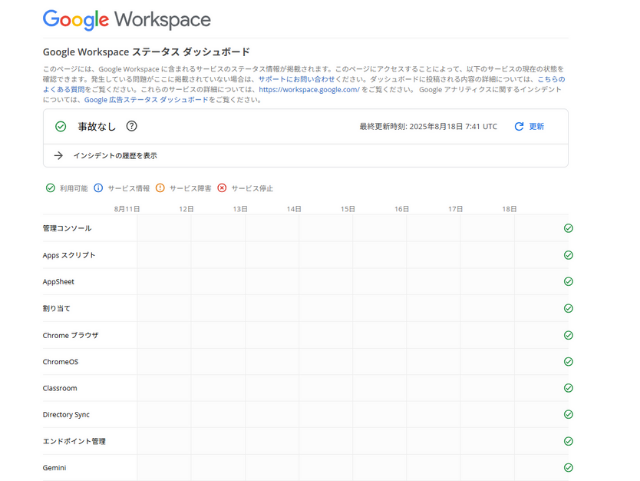 少し時間を置いてから再度ダウンロードを試すか、Google Workspaceのステータスダッシュボード(Google Chrome で「Google Workspace ステータス」と検索)で障害情報が確認できます。