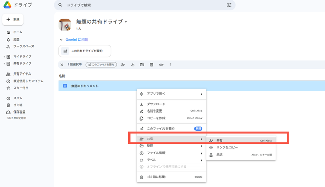 - 制限したいファイルまたはフォルダをGoogle ドライブ上で右クリックします。