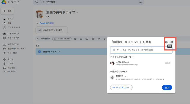 - 共有設定ダイアログが表示されたら、歯車アイコンをクリックします。