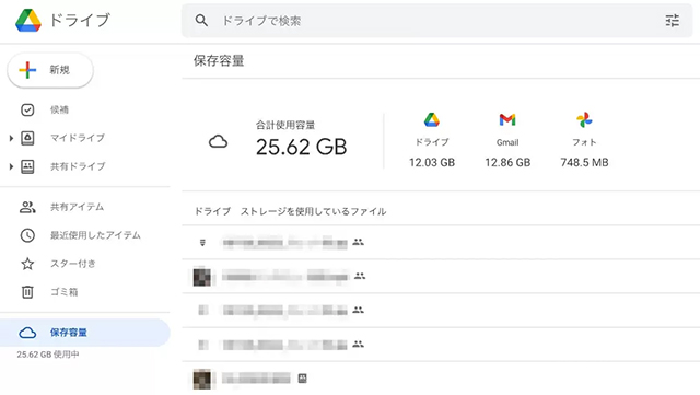 Google ドライブを開き、左枠の下部にある「保存容量」で使用状況が確認できます。「保存容量」をクリックすると保存されているファイルやシートが表示されます。