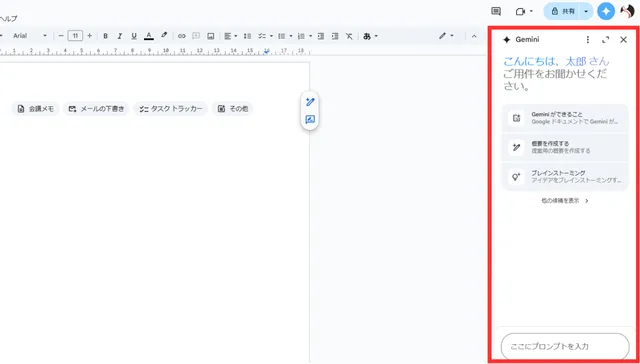 詳しい使い方:Google ドキュメントの Gemini の使い方。AI で文章生成を時短!