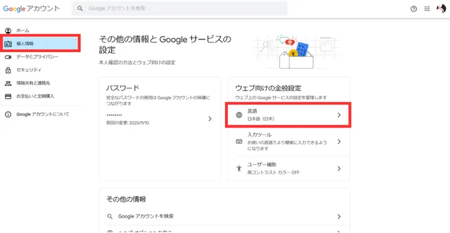 - 左側のメニューバー「個人情報」>「ウェブ向けの全般設定」>「言語」をクリック