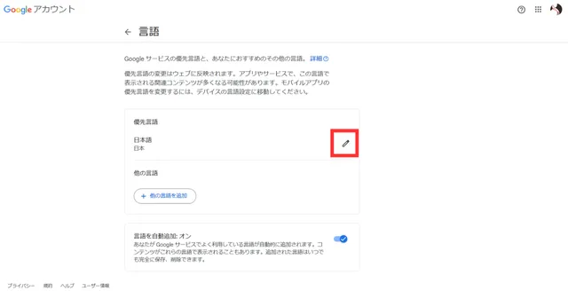 - 優先言語の日本語の横の鉛筆マークをクリック