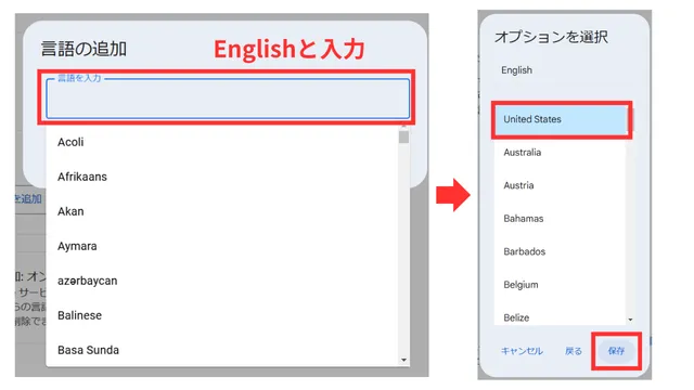 - 「English」>「United States」を選択し、「保存をクリック」