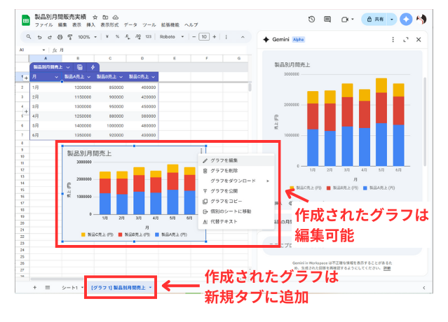 作成されたグラフは編集できますが、元のデータが変わっても自動的に更新されません。データが変わった場合は、必要に応じて再度作成する必要があります。