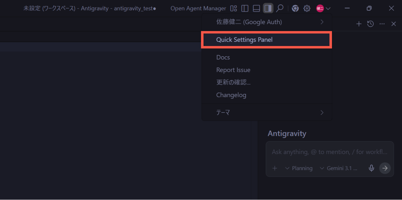 画面右上のアカウントアイコンをクリックし、「Quick Settings Panel」を選択します。 -