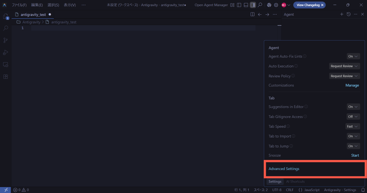 表示されたパネルの右下にある「 Advanced Settings 」をクリックすると、設定専用のウィンドウが開きます。 -