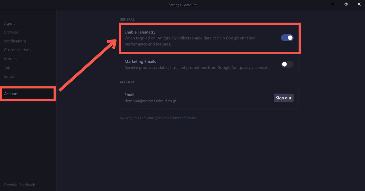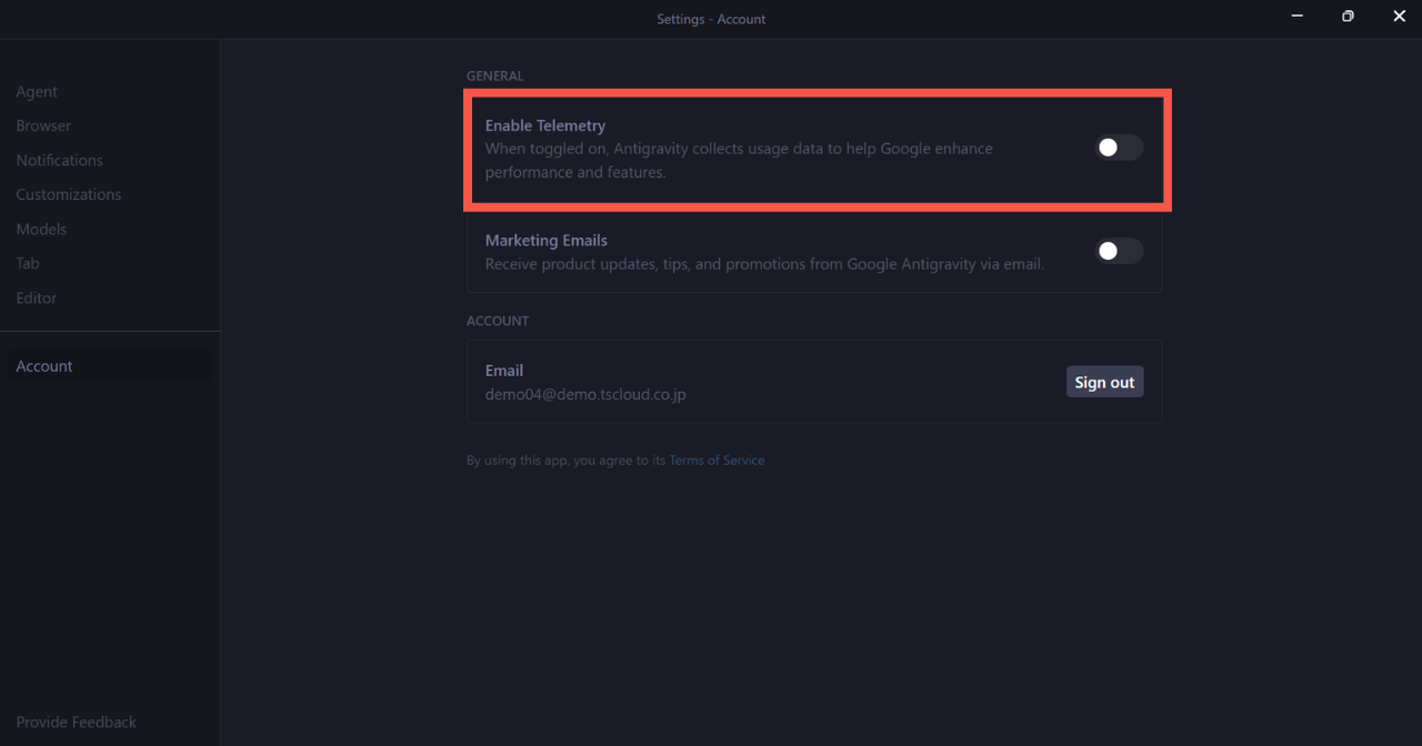 ここで注意すべきは、「Enable Telemetry」の内容です。この項目がオン(有効)になっている場合、 Antigravity は、ユーザーの操作内容(インタラクション)を収集し、モデルの評価・開発・改善のために利用します。自社の情報を学習させないためには、必ずオフの状態にしてください。