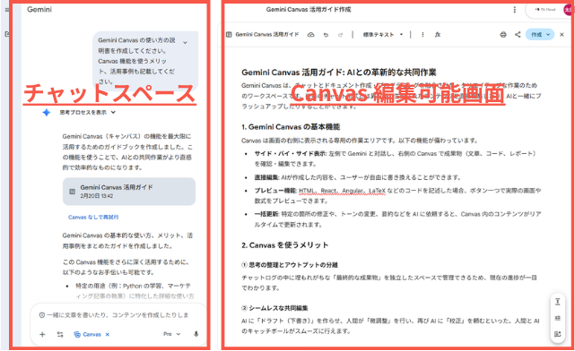 Gemini 画面で Canvas を選択すると独立した編集エリアが画面右側に表示されます。チャットでのやり取りを左側で行いながら、右側の Canvas 上でリアルタイムで修正を進める「サイドバイサイド(並行作業)」環境は、編集作業の負担を軽減します。