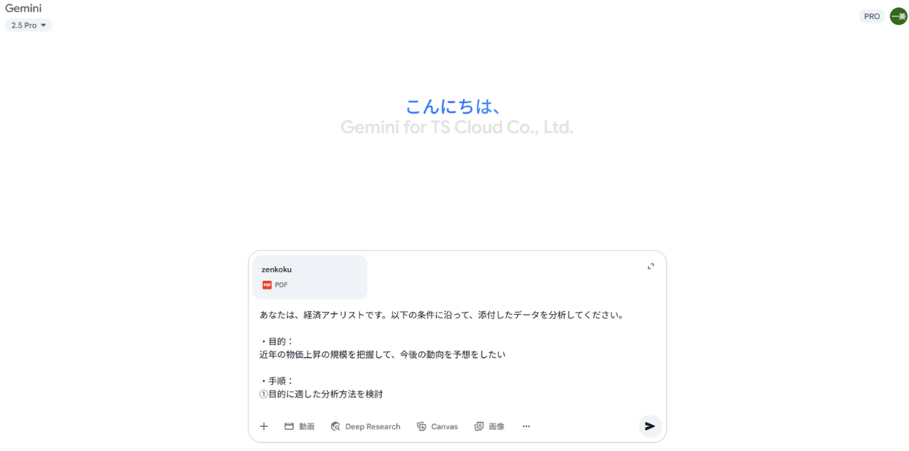 なお、ここではGemini アプリの「2.5 Pro」のモデルを使用しています(Google Workspace の Enterprise エディションを契約)。