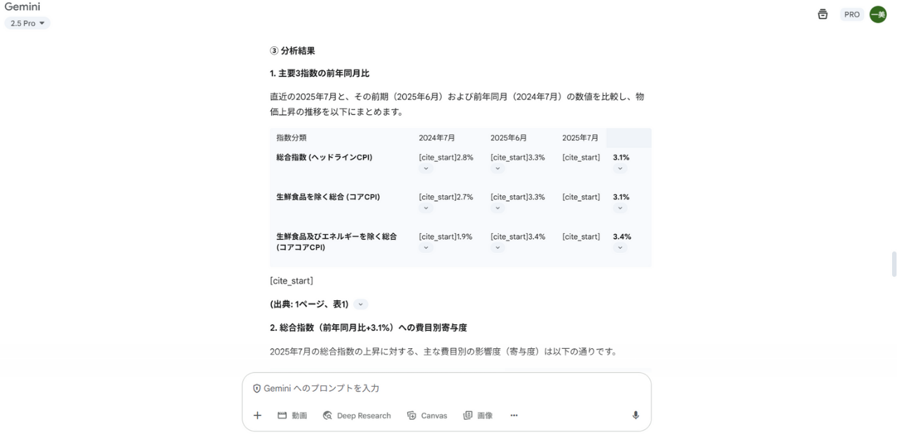 分析したいデータが記載されたファイルを、Gemini へアップロードして分析する方法を紹介します。具体例として、総務省の消費者物価指数(2025年7月分)の資料を使用して、データ分析をしていきます。