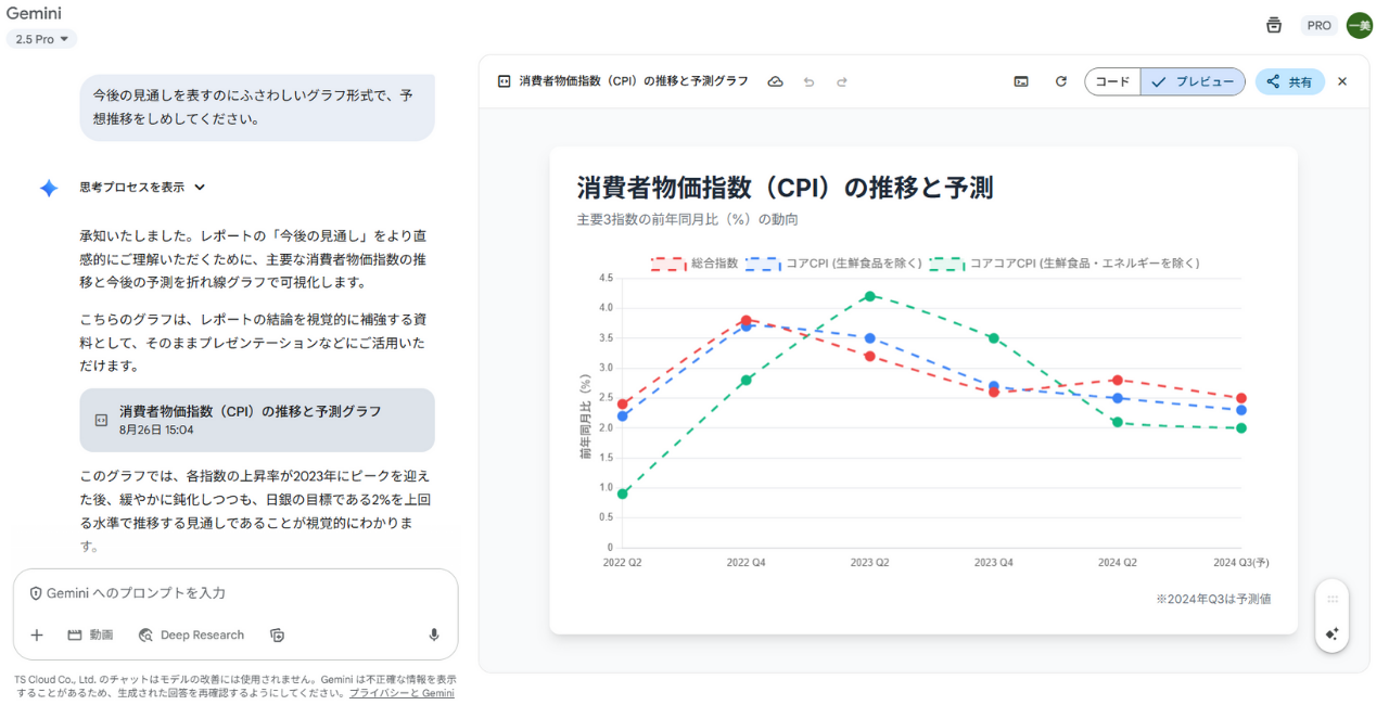 グラフ作成も、大きく表示された画面を見ながら、変更したい点をプロンプトで再入力することで簡単に改善できます。