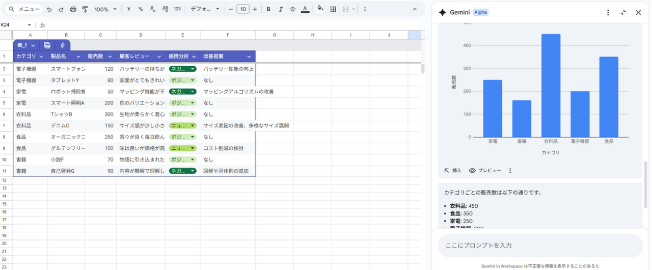 サイドパネルを使うメリットとして、データ編集画面で直接 Gemini の力を借りられる点が挙げられます。データ分析の際に必要となる データの整理、分類なども、関数を用いずにプロンプトで指示すれば簡単 でしょう。