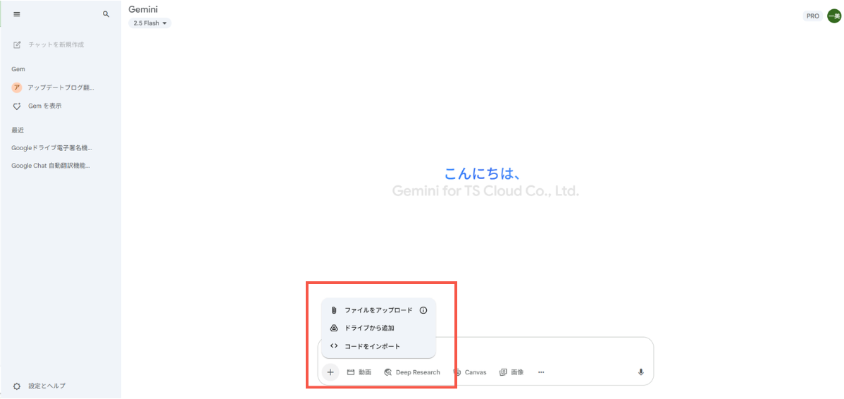 ➤1.Gemini アプリで「+」をクリックし、ファイルを選択