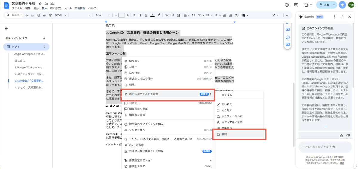 Gemini で文章要約する方法。プロンプトやドキュメント上での使い方も紹介