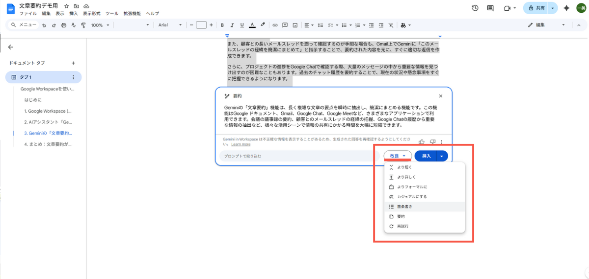 表示される要約を確認し、必要に応じて追加のプロンプトで指示を出して調整します。「改良」をクリックすると「より短く」「箇条書き」など、使いやすい形に瞬時に変換可能です。