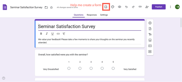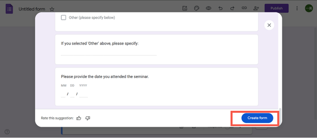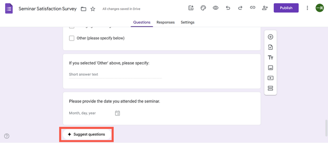 - Gemini がフォームの内容を読み取り、追加の質問を提案します。左下にある「Suggest questions」をクリックするだけで、フォームに適した質問を AI が提案してくれます。