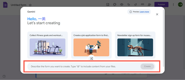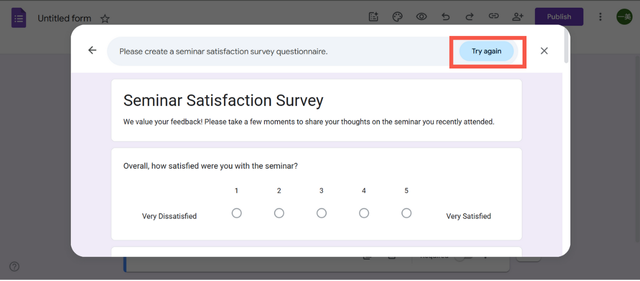 - フォームの目的や内容など、プロンプトを入力して「Create」をクリックすると、Gemini が瞬時に質問事項を生成します。必要に応じて再生成(Try Again)も可能です。
