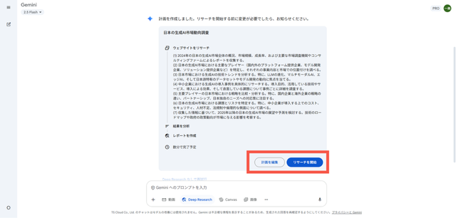 プロンプトを送信すると、Gemini は情報収集のための計画を立ててくれるので、確認します。ここで「計画を編集」をクリックすると、必要に応じて「○○の内容を追加してほしい」といった指示を追加することも可能です。
