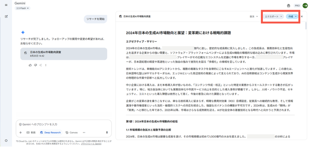 生成結果は、右上の「エクスポート」から「Googleドキュメントにエクスポート」または「コピー」して共有できます。