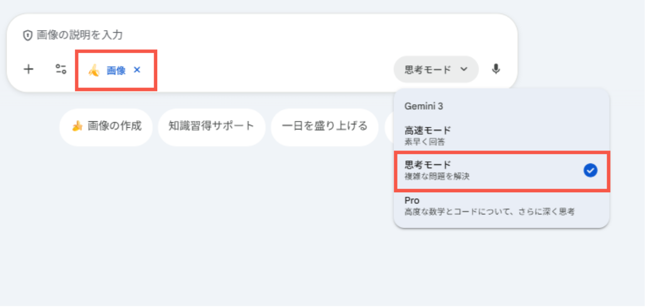 最も手軽に Nano Banana Pro を体験できるのが Gemini アプリです。アプリ内の「画像の作成」機能において、「思考モード」「Pro」を選択することで Nano Banana Pro による高精細な画像生成が可能 になります。