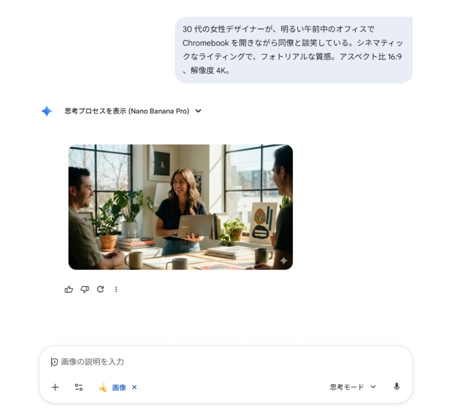 「 30 代の女性デザイナー(主語)が、明るい午前中のオフィスで Chromebook を開きながら(文脈)同僚と談笑している(動き)。シネマティックなライティングで、フォトリアルな質感(スタイル)。アスペクト比 16:9 、解像度 4K (技術指定)」