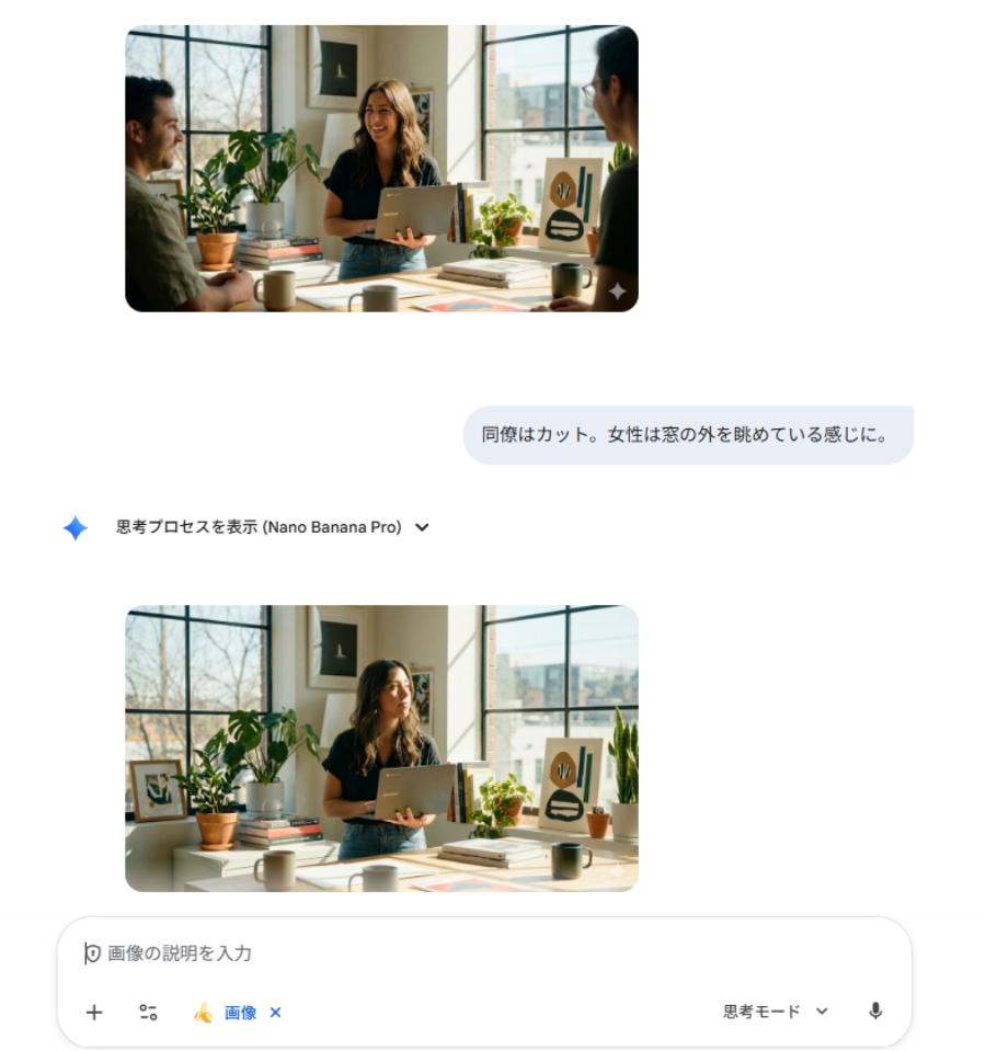 一度生成された画像の一部だけを直したい場合、再度作り直す必要がないのも Nano Banana Pro の特徴です。チャットで「右側の人物の服装をスーツに変えて」「背景をもっと明るい朝の光にして」といった指示を出すだけで、被写体の一貫性を保ったまま特定の部分だけを修正可能。この部分修正機能により、デザイナーの作業時間を大幅に短縮します。