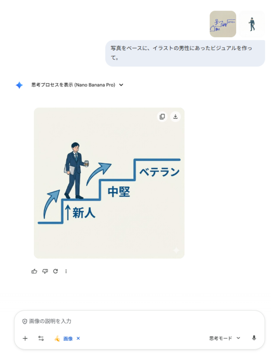 手書きのメモとイラストの男性を Nano Banana Pro に読み込ませます。すると、以下のようにメモの情報を整理し、イラストを加えた画像を生成します。