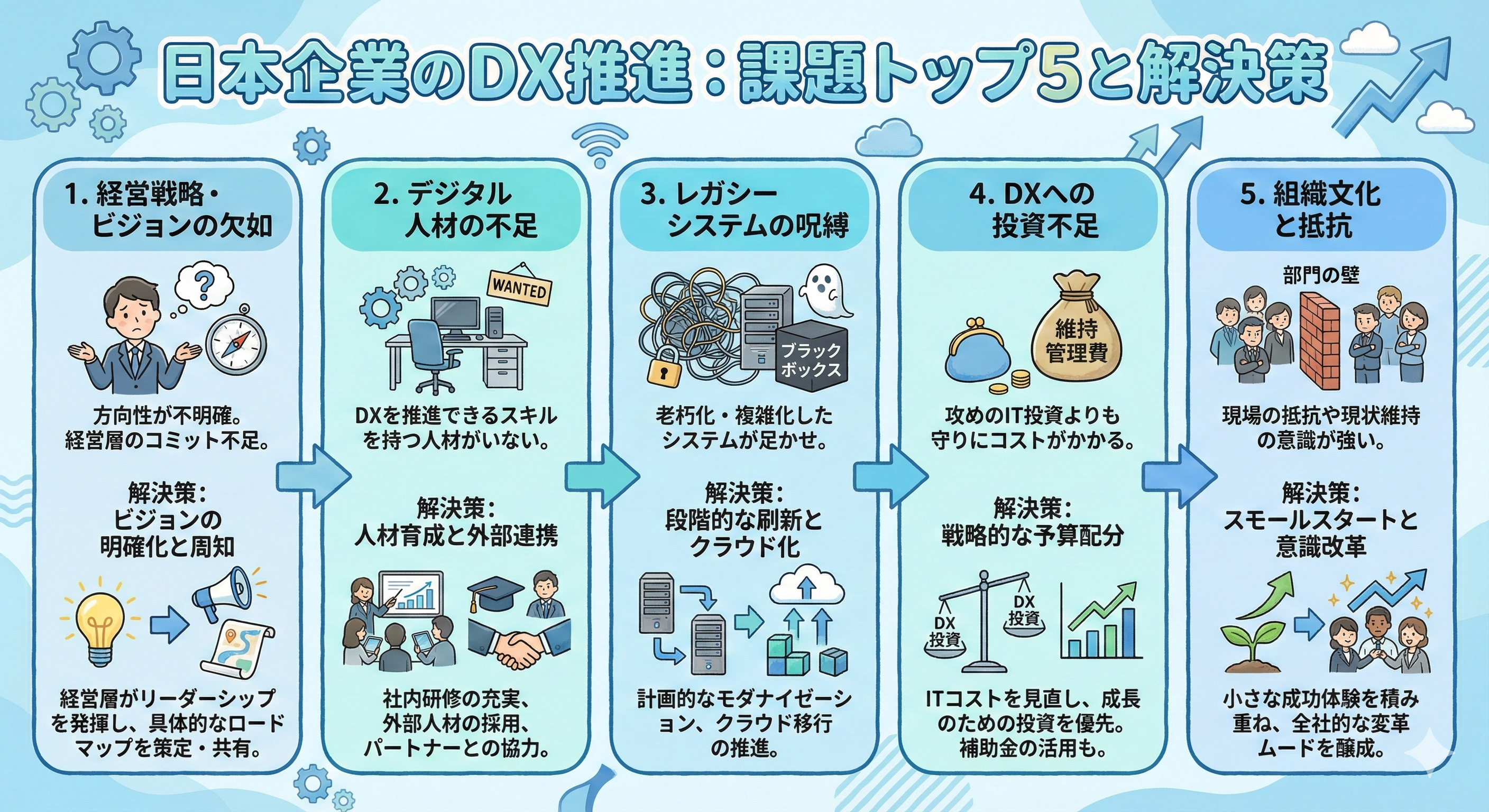 たとえば、「日本企業の DX 推進の課題トップ 5 を、解決策とともに水色を基調としたポップなインフォグラフィックにして」というプロンプトを出します。
