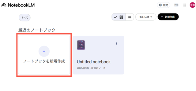NotebookLM にログインし、新しいノートブックを作成します。