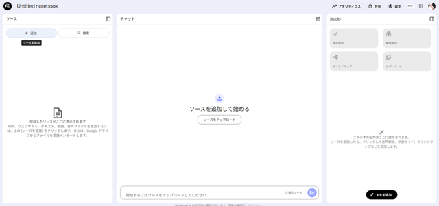 情報源(ソース)をアップロードすると、AIが内容を学習し分析を開始します。