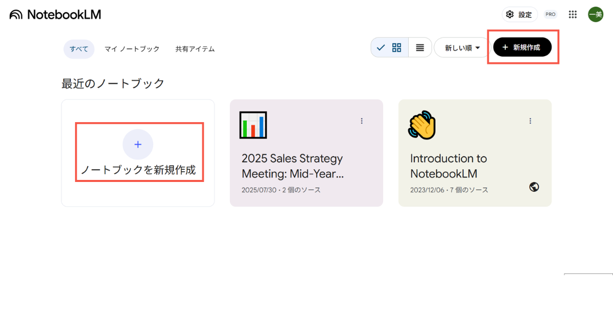 ➤1.NotebookLM にアクセスし、新しいノートを作成する