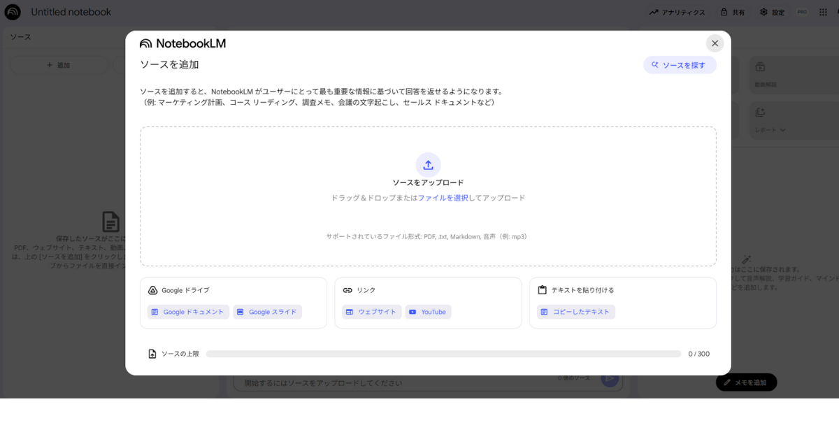 追加できるファイルのサイズには上限があり、最大 200 MB までとなっています。同じノートブックに最大 50 個のソースを含めることができるため、長時間の会議など容量の大きいファイルは、分割してからアップロードするとよいでしょう。