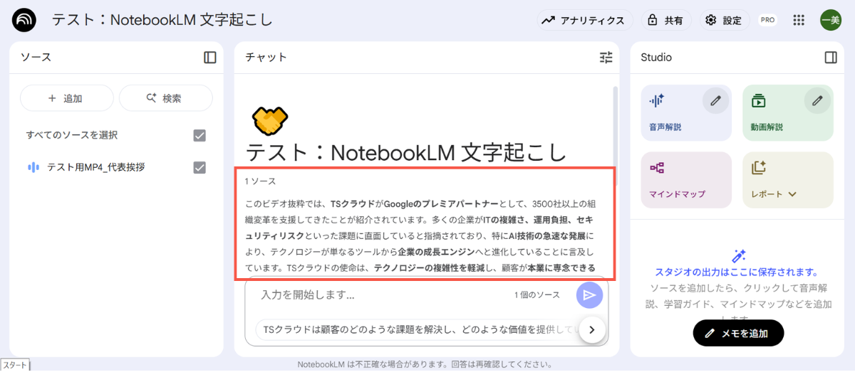 音声ファイルをアップロードすると、NotebookLM が 自動的に内容を読み込み、「チャット」に概要を表示 します。この自動生成された概要により、音声ファイルを再生することなく内容を把握することが可能で、その後の作業を効率的に進められます。