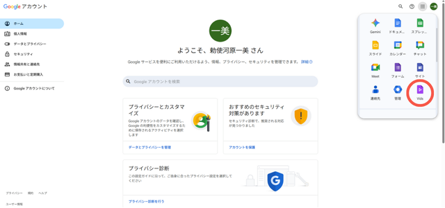 Google Vids を立ち上げるには、Google Workspace にログインして、アプリランチャー(アイコン隣にある9つの点)から「Vids」をクリック。またはブラウザで「Vids.new」と入力して Enter キーを押します。