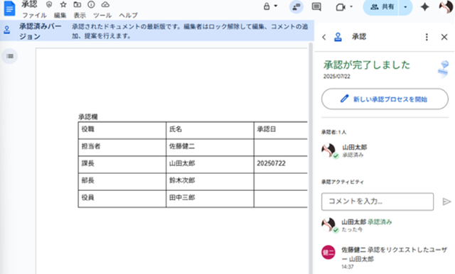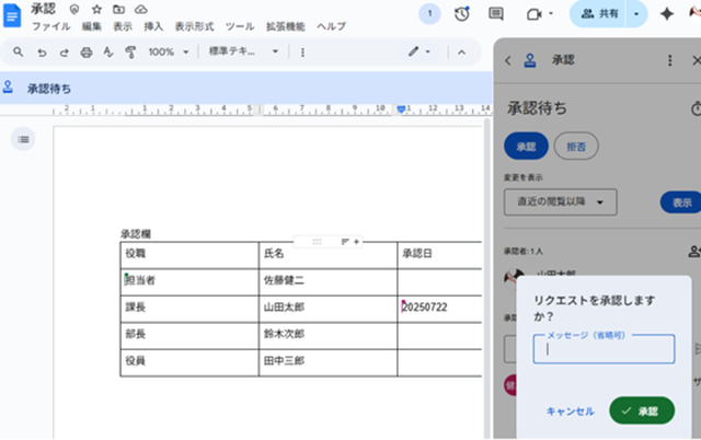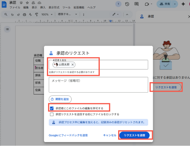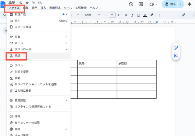 Google ドキュメントを例に、承認フローを設定する基本的なステップを紹介します。スプレッドシートでも同様の手順で設定が可能です。