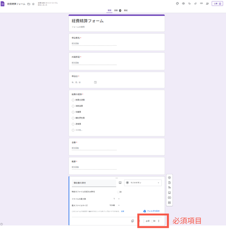 必要な項目を追加し、領収書の添付欄を設けます。必須項目を設定することで入力漏れを防げます。