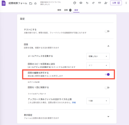 「設定」のタブで「回答の編集を許可する」をONにしておいてください。